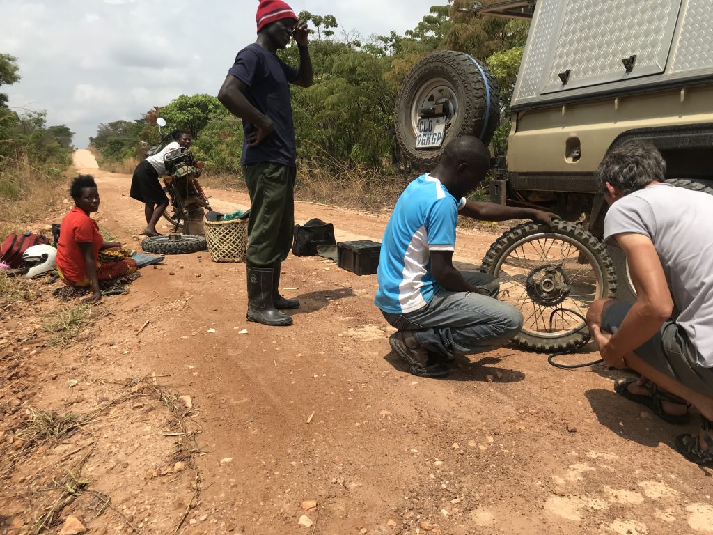 Wir beschließen unsere Route zu ändern und nicht über die Wasserfall-Route entlang der kongolesischen Grenze, sondern auf direktem Weg zum Tanganyikasee zu fahren. Mit nur einem Zwischenstopp sparen wir so 2 volle Tage, die wir lieber am See verbringen wollen. +++ Leider verzögert sich unsere Abreise aus Mutinondo: die Autobatterie ist leer und wir müssen überbrücken. Fast bauen die hilfreichen Unterstützer die Autobatterie aus, bis wir es dann doch noch mal mit unseren eigenen Überbrückungskabeln versuchen. Jetzt springt der Motor an. +++ Übernachtung an den mäßig spannenden Chishimba Falls kurz hinter Kasama. Unsere nächtlichen Aufpasser laden wir noch zum Dinner ein. Nachts regnet es. das ist ungewöhnlich für  Anfang Oktober. Spannend ist auch die Preispolitik. Einheimische Zahlen 7 Kwacha (etwa 55 Cent), internationale Gäste 15 Dollar pro Person. +++ Früher Aufbruch am nächsten Tag. Erst machen wir schnell Kilometer auf einer gut ausgebauten Asphaltstraße. Dann folgen 170 scheußliche Kilometer auf schlechter Piste. Zeitaufwand: rund sechs Stunden. Unterwegs leisten wir diesesmal Pannenhilfe. Reifenplatzer bei einem Motorrad. +++ Wir erreichen Ndole Bay gegen 16 Uhr und werden für alle Anfahrtsmühen entschädigt. Willkommen im Paradies. Nur mit dem Campen auf der Düne klappt es trotz Allrad, Diff-Lock und Low Gear nicht. Wir bleiben im Tiefsand stecken und müssen jetzt erstmal den Wagen wieder freischaufeln.  +++ Abends gibt es Fish & Chips im Restaurant. Der Campingkocher hat heute Ruhetag. +++ gefahrene Kilometer: 654