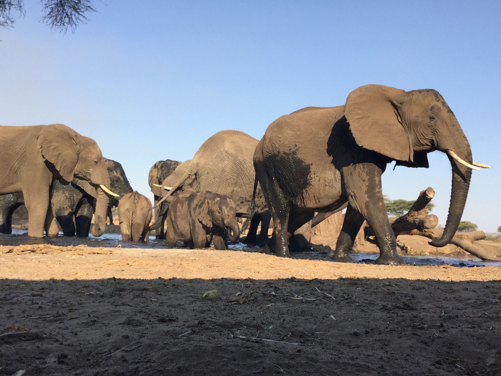 Good bye Elefant Sands, so richtig schade ist es nicht. Vor Abfahrt vergnügen wir uns noch an ein paar Elefanten, die per Rüssel versuchen Duschwasser aus den Abolution Blocks abzugreifen und dabei einige Leute nachhaltig verschrecken +++ kurze Fahretappe mit Game-Drive-Charakter: Warzenschweine, Strauße, Elefanten und sogar eine Giraffenfamilie am Wegesrand +++ Senyati Rest Camp ist Elefantentraumland, wunderschön gelegenes Wasserloch, ein Aussichtshide und ein Beobachtungsbunker und viele Elefantenfamilien, die in aller Ruhe kommen und gehen. Dazwischen das Elefantenschönheitsprogramm: erst Wasser, dann Schlamm, dann Staub. Nachts noch Elefantenbesuch vor unserem Auto +++ Abfahrt Elefant Sands 9 Uhr, Ankunft Senyati Rest Camp (10 km vor der Grenze zu Zambia) 12.30 Uhr, gefahrene Kilometer: 250