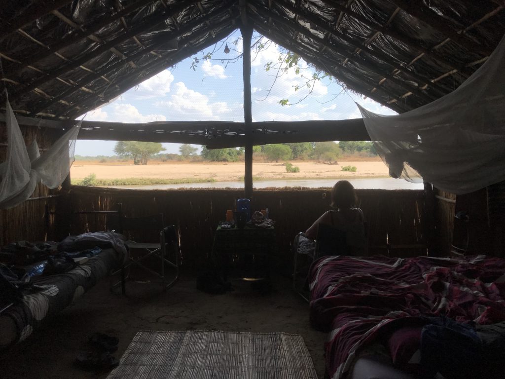 Die Chalets bieten besten Blick auf den Mwaleshi River, Open-Air-Dusche und -Klo und nächtliche Elefantenbesuche am Fluß. Mit seinen rustikalen Charme passt das Camp perfekt in die umgebene Landschaft. Nichts ist hier zuviel, der Luxus ist die Wildnis. Man passt sich den Bedingungen an. Mag sein, dass dieser Umstand dazu führte, dass Kirsten sich unfreiwillig von ihren wichtigsten Ausrüstungsgegenstand trennen musste: den Bite-Away-Mückenstift! Verloren während des Abend-Gamedrives irgendwo im Busch. Eigentlich ein Grund zum sofortigen Abbruch unserer Reise, würde nicht die raue Aura der Wildnis einen gewissen Einfluss nehmen. Denn: der am selben Tag (!) abgebrochene Zahn wird mit einer Nagelpfeile glattgeschliffen. Und Insektenstiche werden ab sofort mit dem heißen Metall eines Big-Einwegfeuerzeugs behandelt.