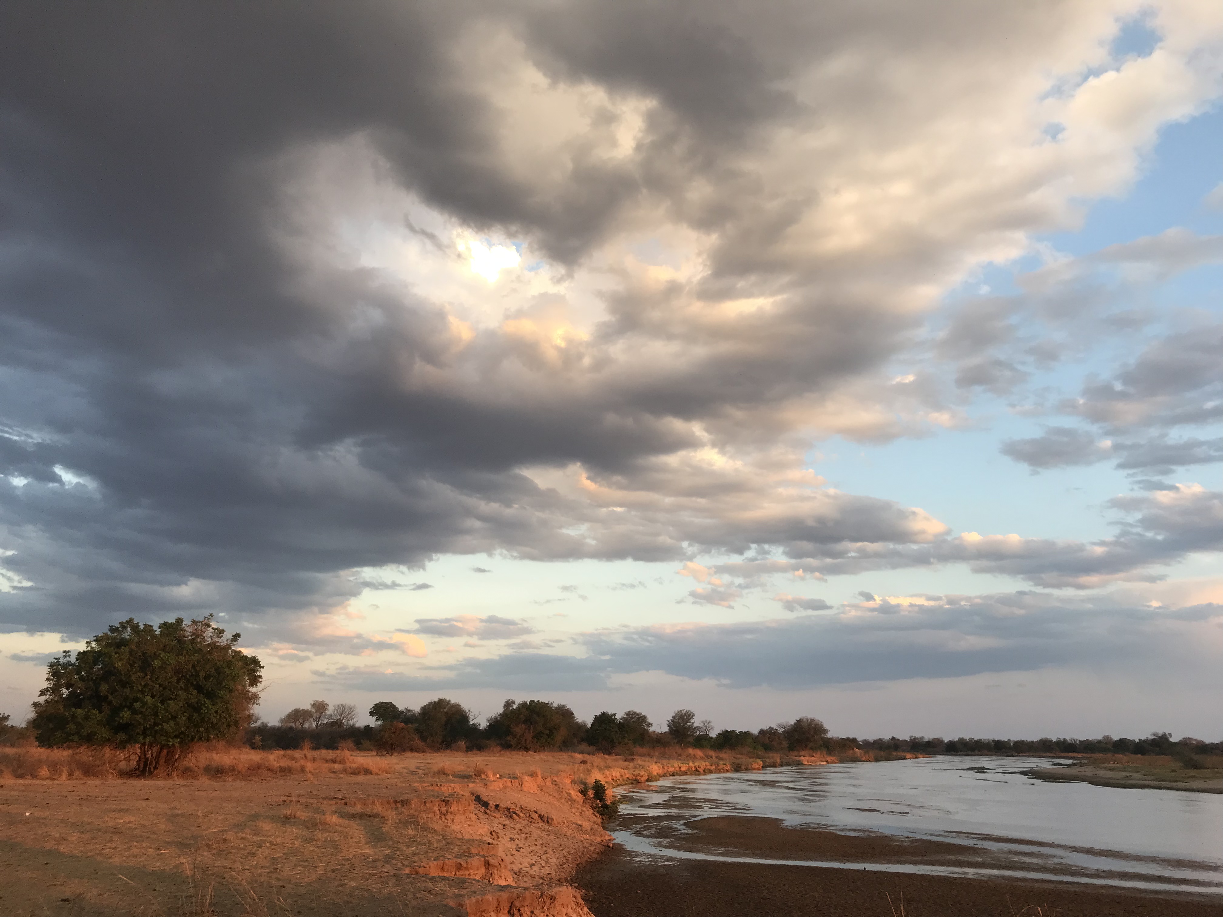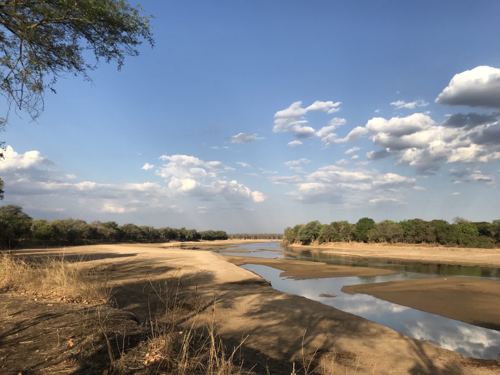 Tote Baumstämme – vor über 30 Jahren zugesetzt von Elefanten, Buschfeuern und Dürre – ragen wie knöchrige Finger aus der Ebene. Zur Mittagszeit ist es unerträglich heiß. Dort, wo es Schatten gibt, erreicht das Thermometer locker die 40 Grad-Marke und schon morgens um 7 Uhr werden die 30 Grad überschritten. Das grelle Sonnenlicht taucht die Szenerie in fahles grau. Und mitten drin: ein schmales Band grüner Vegetation an den Uferrändern des Mwaleshi River, der einzigen Lebensader in der Trockenzeit im Westen des North Luangwa. Der Fluß ist nur ein wenige Zentimeter tiefes Flachwasser. Kein Vergleich zur reißenden Wassergewalt während der Regenzeit, die beständig an den steilen Uferböschungen zerrt und oft ganze Camps wegspült.