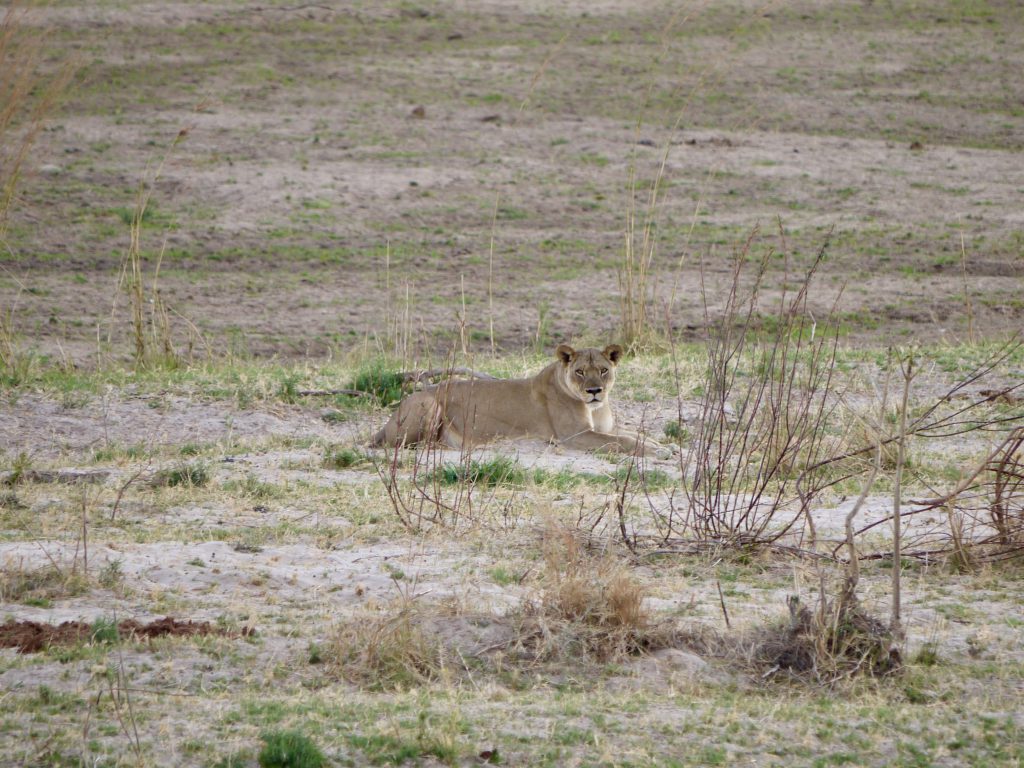 Während man durch scheinbar verlassene Buschlandschaft streift, erspähen die scharfen Augen unserer Guides auch die kleinste verdächtige Bewegung und können diese auch schon einem Tier zuordnen, wohingegen wir noch nicht einmal eine Bewegung wahrnehmen. So kommt es, dass wir plötzlich hinter dichten Buschwerk auf eine Büffelherde von über 100 Tieren stoßen. Und schon wenig später können wir auch die sich heranpirschenden Löwen sehen. Aus bester (und sicherer Entfernung) beobachten wir, wie sich die 5 Weibchen, ihren Jagdinstinkt folgend, den Büffeln nähern, während die 3 Männchen uns zwar kurz in Augenschein nehmen, dann aber doch gelassen an ihren Platz verharren.