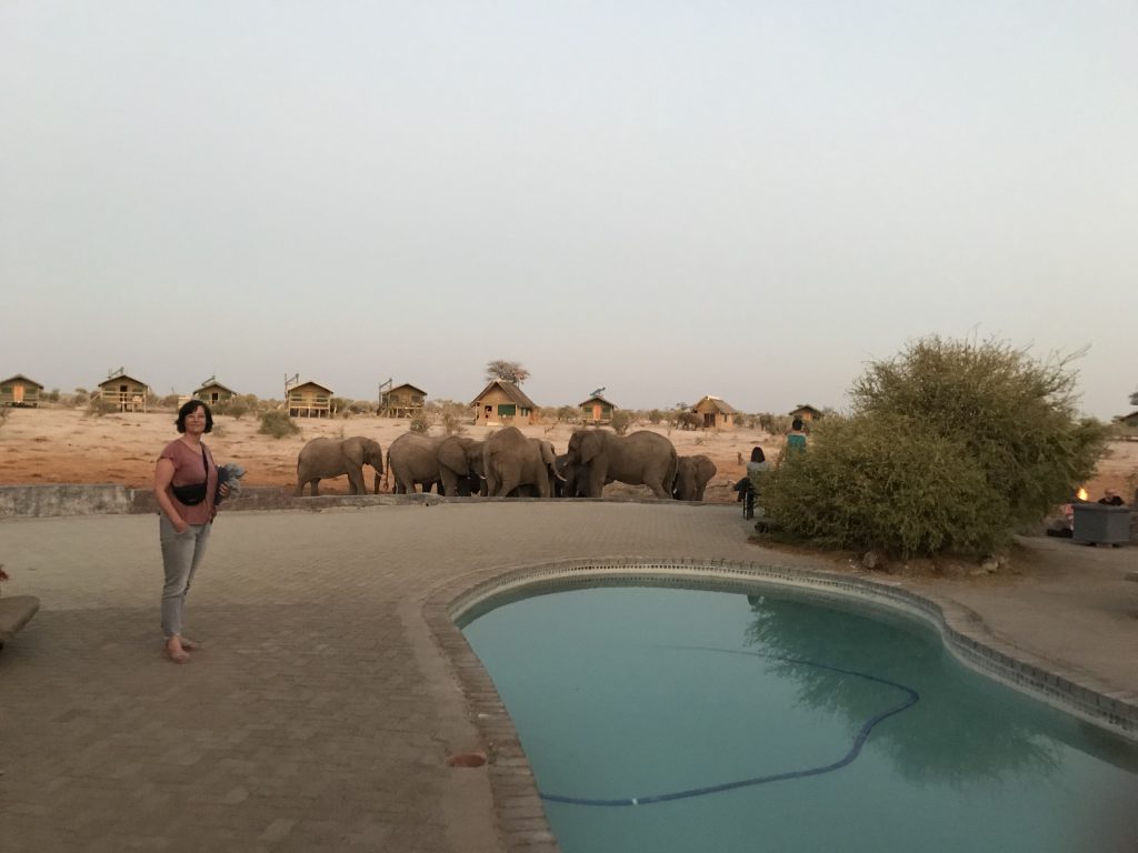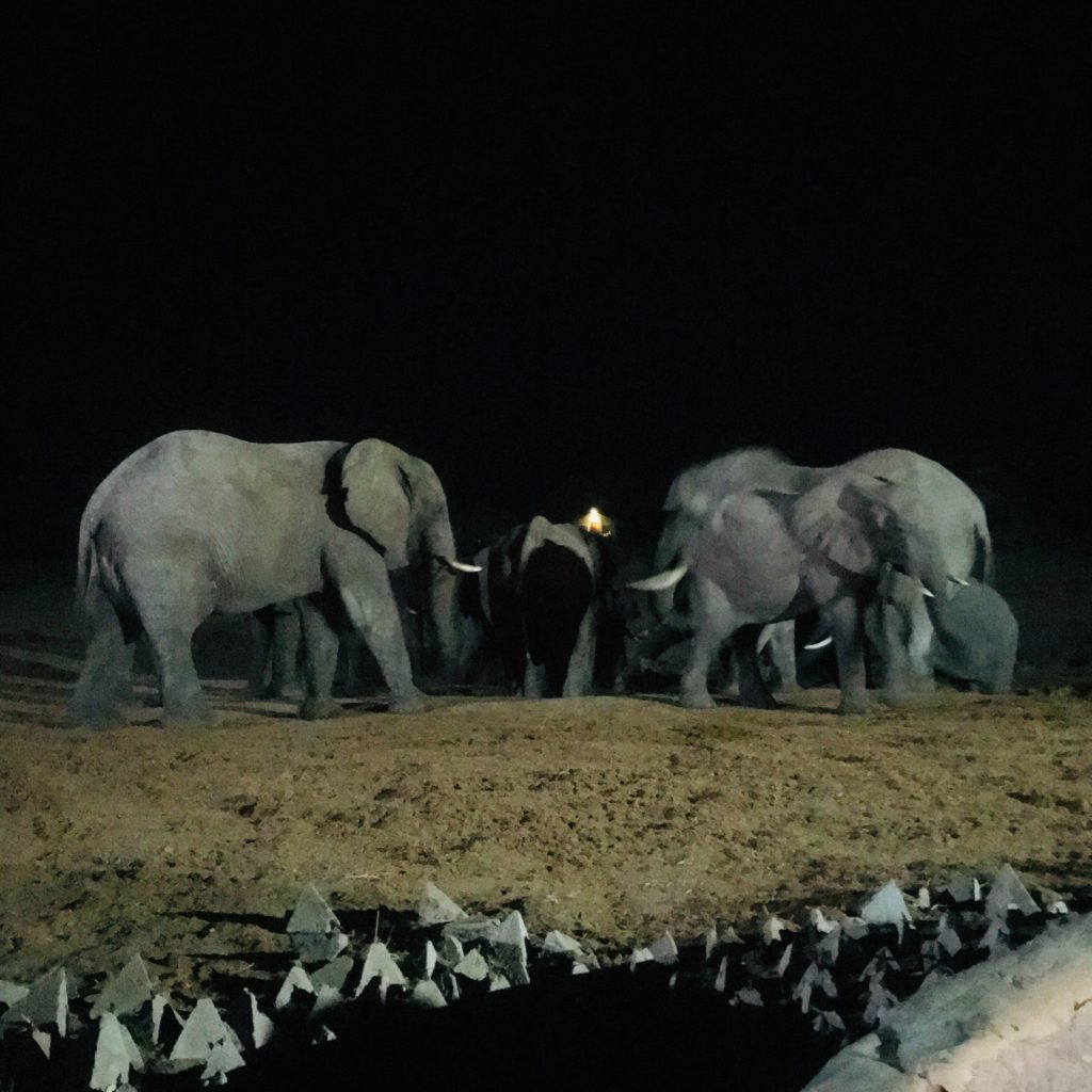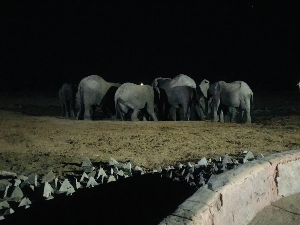 Treffpunkt ist die Bar am Wasserloch. Terassenartig erstreckt sie sich bis auf Schlagdistanz an das von Elefantendung überzogene Loch. Der strenge Geruch von Elefantenpipi zieht in die Nase. 20 Elefanten schubsen, drängeln, organisieren sich vor den Augen der Dinnergesellschaft. Mit dem Bier in der Hand, dem Gin Tonic auf dem Tisch oder der Flasche Wein unterm Arm wird geselfied, was das Zeug hält. Bestes Instgramm-Matertial für den Oh und Ah-Faktor bei den Daheimgebliebenen. Die Stille Betrachtung der Natur muss Party und Buffet weichen. Man mag den Elefanten zurufen: Empört Euch! Trampelt die Sperren weg und sauft das Wasser aus dem Pool restlos leer. Holt mal ordendlich mit dem Rüssel aus und schlagt den Idioten die Lampen aus der Hand, die wohl noch auf dem Mond sichtbar sind. Entert das Buffet und lässt keinen Krümel übrig. Holt Euch Euer Wasserloch zurück! Und die Elefanten? Sie kommen, Jungesellen und Familienclans, klären die Hierarchie, helfen den Kleinen beim Ab- und Aufstieg, begegnen einander mit Respekt (und wenn nicht, wird nachgeholfen), gucken ab und an hoch zur Terasse und denken: was für ein Zirkus. Und gehen ihrer Wege.