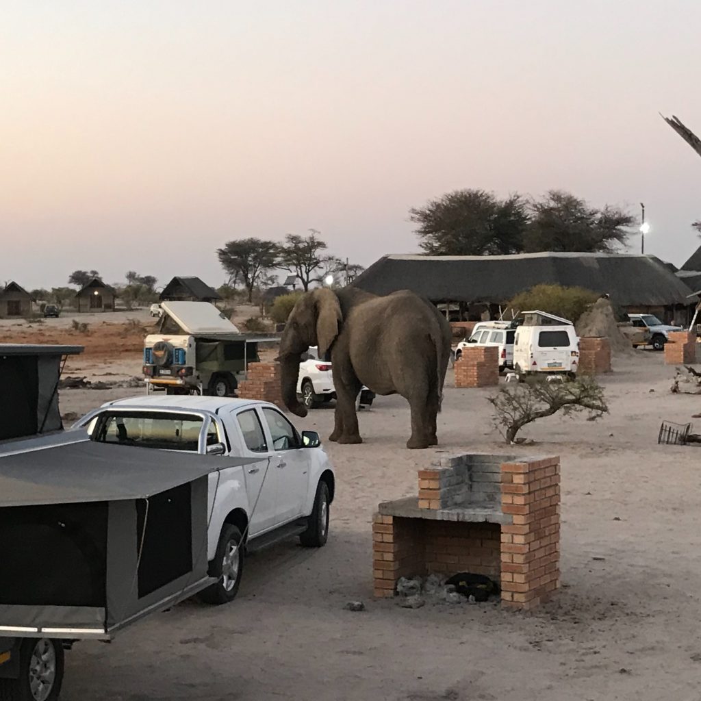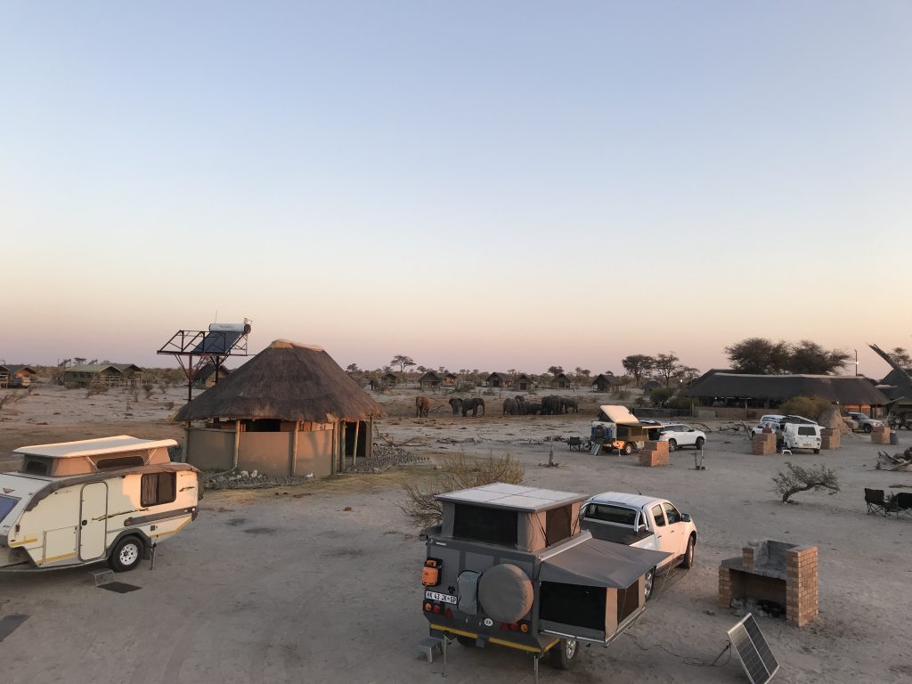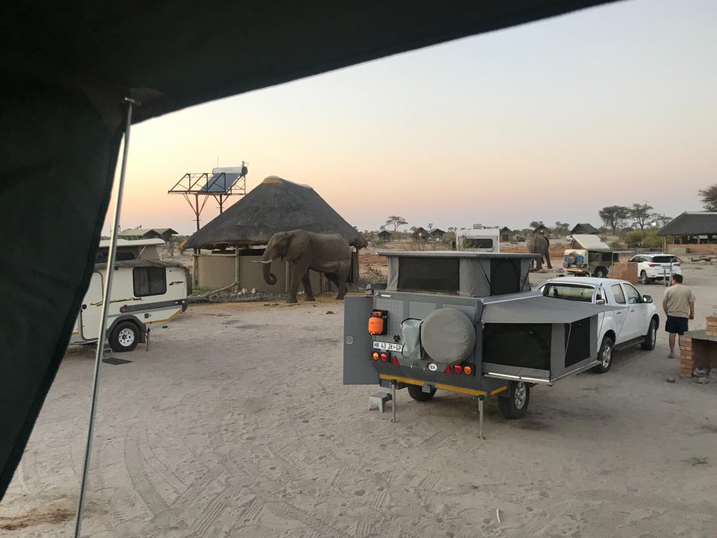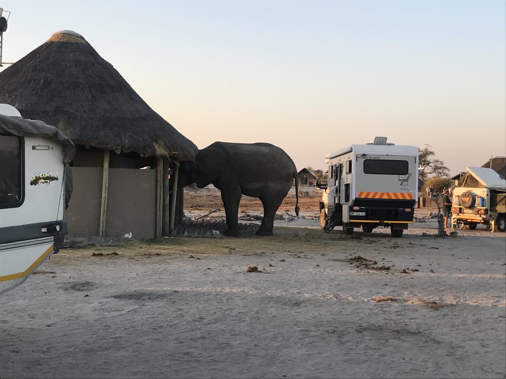 Elefant Sands ist eine große, fast baumlose sandige Fläche mit einem Wasserloch. Rundrum gibt es je nach Kassenlage der Reisenden Zeltchalets oder Campingplätze. Hochgerüstete Outdoormobile konkurrieren mit Overlander-LKW um die besten Plätze.