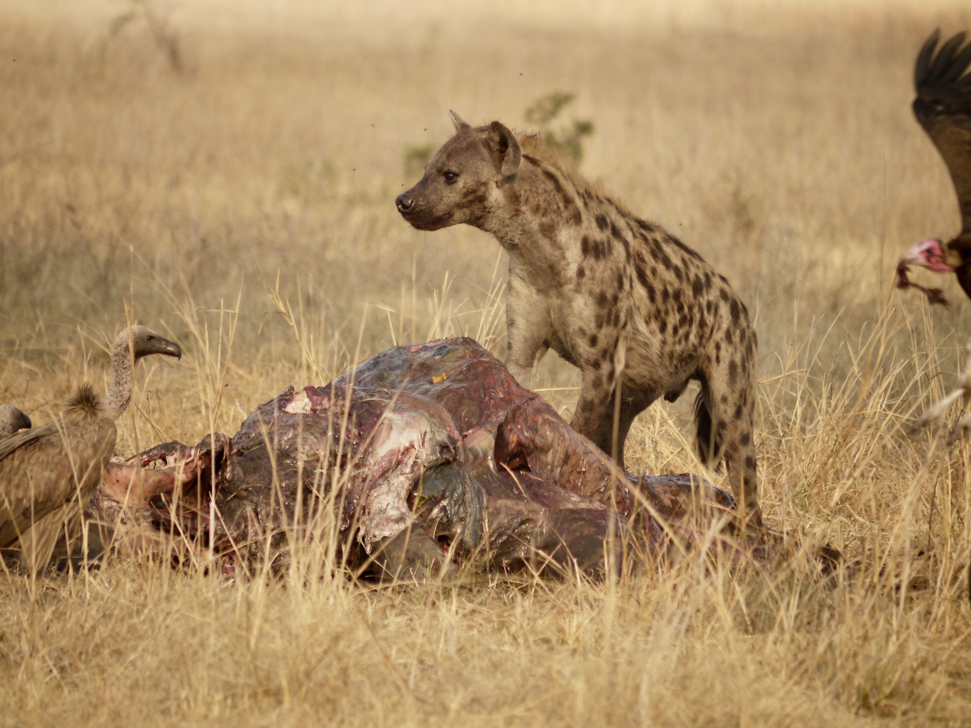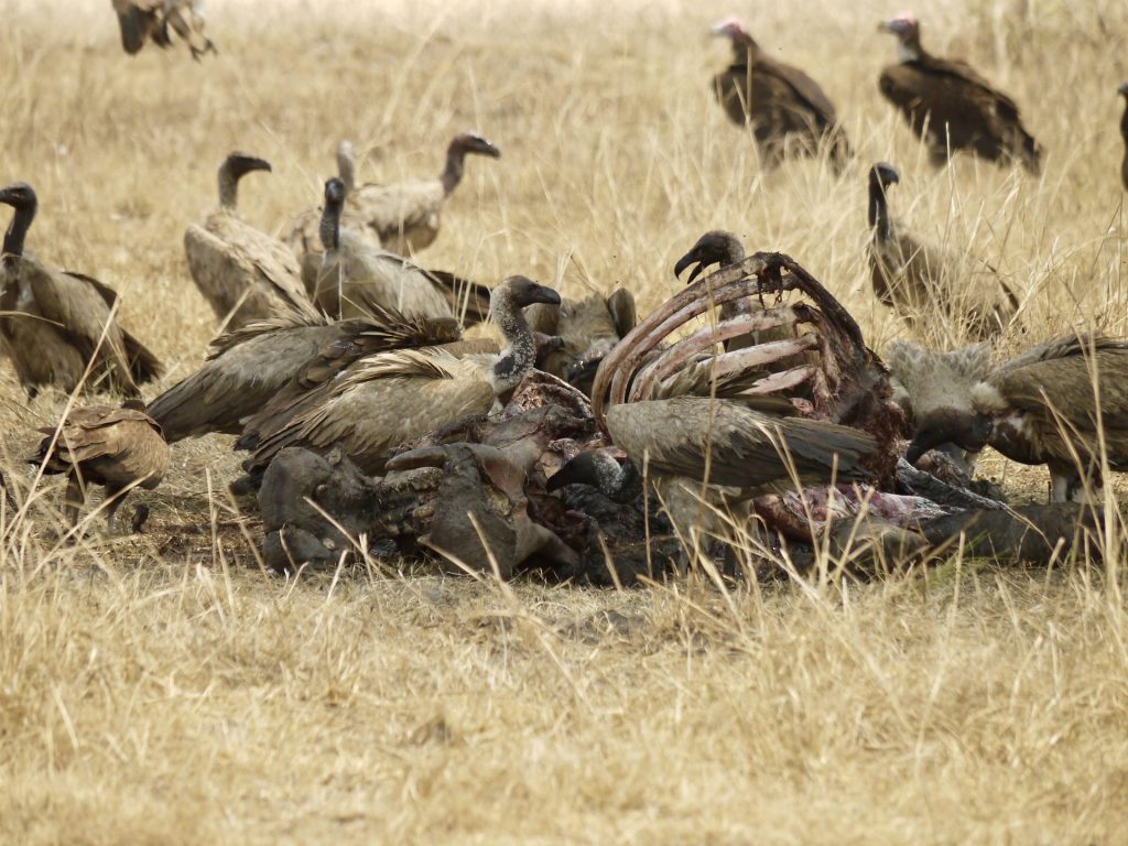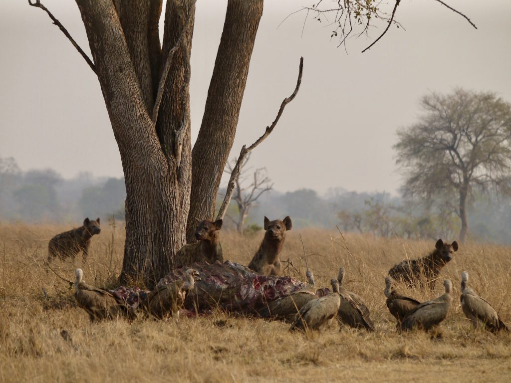 Highlight unseres Gamedrives in den Lufupa-Ebenen: Ein Hippo-Kill, das vor 2 Tagen fast einen Kilometer vom Fluß entfernt von Löwen erlegt wurde, ist nun die Mahlzeit eines Hyänenrudels. Später sind dann die Geier an der Reihenfolge – und innerhalb weniger Stunden sind dann nur noch Gerippe übrig…