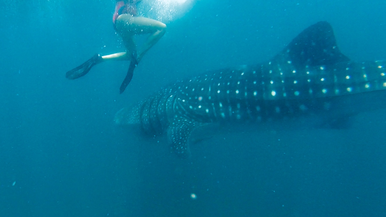 Noch während die Gedanken um diese Fragen kreisen, hören wir “Manta ray on the right!” – das Signal “to go out”: runter vom Boot, ins Wasser, keine Fragen mehr, nicht nachdenken, eintauchen ins Blau, hektisches hin und her blicken, wo? Und dann: aus dem Nichts taucht eine Silhouette auf. Erst noch undeutlich, dann immer näher und klarer: ein Mantarochen schwebt majestätisch mit seinen 5 Metern Spannweite nur wenige Meter vorbei! Begleitet von zwei Riffhaien zieht er ungestört seine Bahnen und verschwindet wieder der trüben, blauen Weite, genauso so wie er aufgetaucht ist. Wir gehen an die Wasseroberfläche und können es nicht fassen! Doch nur einen Augenblick später kommt von Boot der Ausruf des Skippers: “Whaleshark is coming!”.