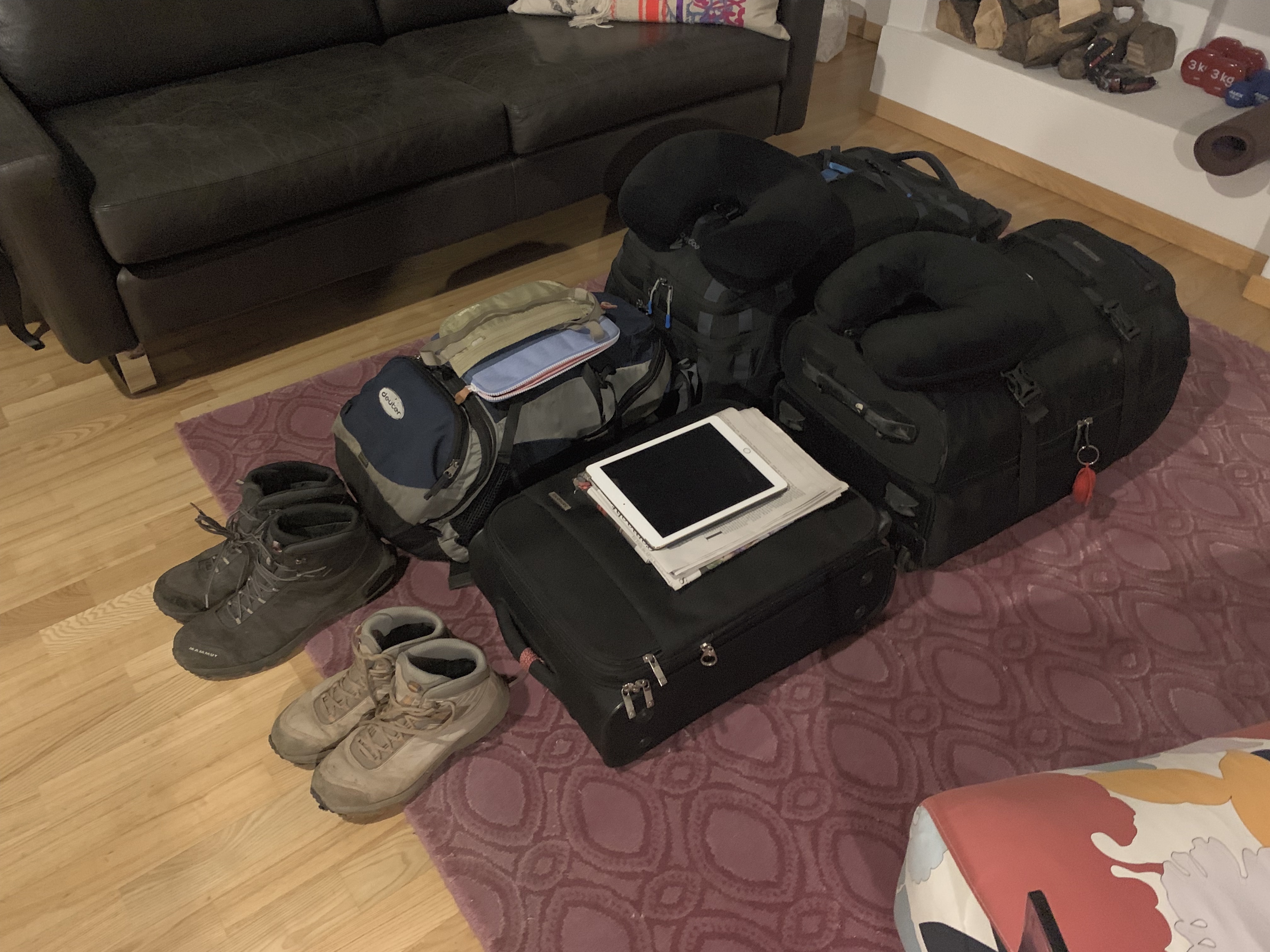 Gefühlte 500 Checklistenpunkte später sind die ganzen Dinge mit viel Drücken und Stopfen und Pressen in zwei Reisetaschen, einem Trolley und einem Rucksack verstaut.